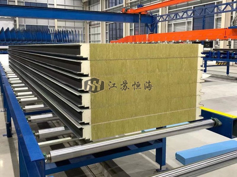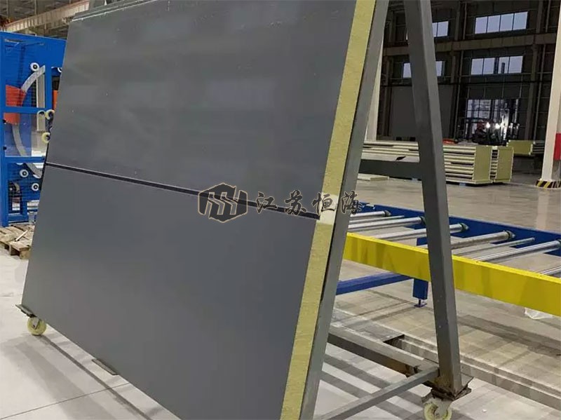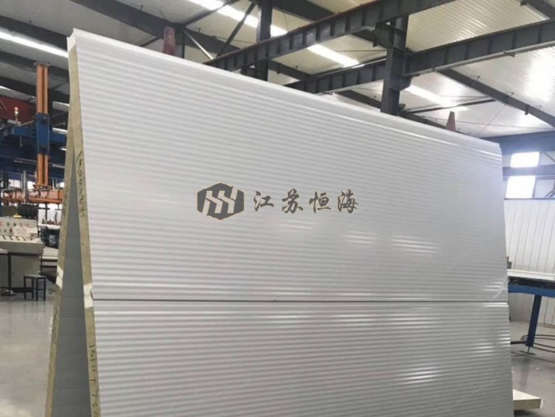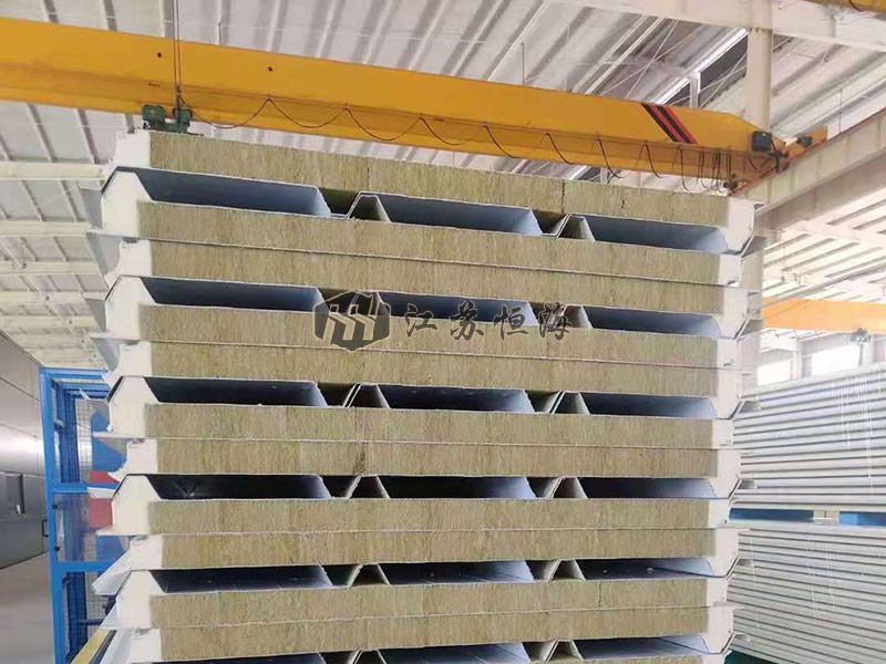 3.強度優(yōu)良:聚氨酯封邊巖棉板材料與兩層鋼板一體粘合,在共同作業(yè)的基礎上,再從頂板的上面加入波壓模具。其整體的剛度與夾有壓模夾板的巖棉(玻璃絲棉)的現(xiàn)場的復合板材相比相差甚遠。通過連接條和板卡進行固定,大幅提高了頂面整體的剛性,強化了頂面整體的工作性能。因為選擇巖棉的芯板,能采用大的螺距,能節(jié)約分片量的1/3 ~ 2/3。